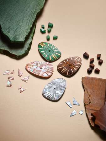 Para evocar as estações, Tadao Ando idealizou a marchetaria colorida – de aventurina verde, olho de tigre e madrepérola rosa ou branca. Os artesãos da Bulgari traduziram habilmente essa visão no mostrador dos relógios. Eles começaram selecionando meticulosamente os fragmentos mais visualmente marcantes de cada material. Cada peça foi então traçada e cortada com precisão. Por fim, os fragmentos foram cuidadosamente encaixados e montados, criando um jogo de cores e reflexos com expressividade orgânico. Destacando esta composição artística estão duas fileiras de diamantes incrustadas ao longo da cabeça da serpente.