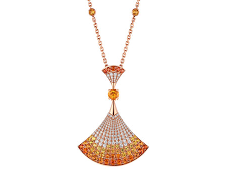 A proposta da cornalina é ampliada com a chegada de um anel, pulseira e brincos para complementar o colar existente ou para criar declarações de estilo individuais. O vermelho quente e rico da cornalina, combinado com diamantes e ouro rosa, é uma prova da genialidade da Bvlgari no trabalho com cores e formas marcantes. Sempre privilegiando a versatilidade, a pulseira e o anel são complementos perfeitos para um conjunto que sinaliza a personalidade única de quem a usa. Os brincos dão ar ainda mais sofisticado a um look todo em cornalina ou um toque de cor para um look diurno versátil.Passando de diamantes brancos a granadas mandarim para o colar, assim como safiras azuis ou rosas para os brincos, o efeito impactante é alcançado através do jogo com as cores e do trabalho meticuloso necessário para cortar cada pedra de modo a formar a curva fluida que se ajusta perfeitamente ao ouro. Um detalhe digno de destaque é o trabalho minucioso dos cravadores que selecionam cada pedra individualmente para diminuir em tamanho e saturação criando um mosaico degradê. O colar de granada mandarim completa um trio de variações de cores, antes limitado às safiras rosa e azuis neste tamanho de pingente. A corrente é adornada com mais granadas mandarim colocadas ao longo de seu comprimento para criar um efeito contínuo. Os brincos, introduzidos para completar a combinação dos colares existentes, encapsulam a essência luminosa da Cidade Eterna, iluminando a pele ou usados com colares combinando para momentos de celebração.