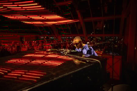 Acompanhando esse momento, em uma união hipnótica de movimento, luz e som, estava a trilha sonora musical de Masego. O vocalista jamaicano-americano, multi-instrumentista e produtor, é famoso por sua mistura característica de Soul, R&B e Jazz. Após a apresentação de dança, para encantar os convidados, ocorreu uma apresentação acústica com curadoria do artista multitalentoso exclusivamente para o Bvlgari Studio. No cenário da interação de luz fornecida pela instalação de Bauder “THE WAVE”, Masego combinou sua voz única com os sons de um piano e um looper, que permitiu a mistura de gêneros musicais descontraídos com sua performance cativante.