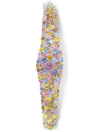 Cravado com 110 quilates de diamantes multicoloridos, é mais uma joia do que um relógio, e também o mais caro da história em termos de valor absoluto.