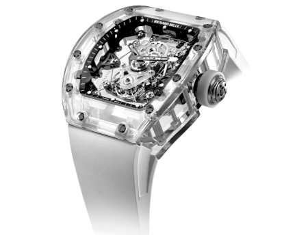 Caixa feita inteiramente em cristal de safira. Mecanismo interno suspenso por cabos — engenharia e design de outro nível.
