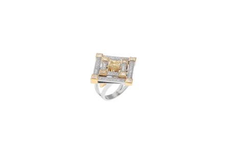Ouro branco e amarelo 18 k, diamante fancy yellow 1,03 ct, diamente 1,63 ct. Preço: R$ 183.860,00.