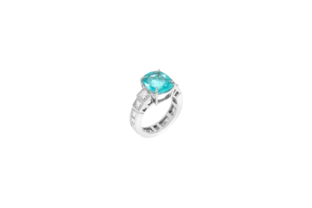 Ouro branco 18 k, turmalina paraíba 5,29 ct, diamante 3,98 ct. Preço sob consulta.