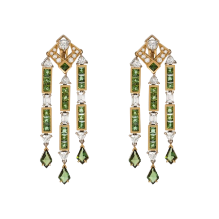 Ouro amarelo e branco 18 k, turmalina verde 5,30 ct, diamante 3,50 ct. Preço sob consulta.