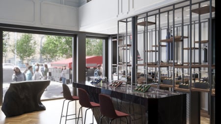 A loja parisiense, a maior da França, ocupa mais de 200 m². Em vez de renovação óbvia, a abordagem do design ecoou num verdadeiro trabalho de restauro. Ampliado e elevado, o espaço é concebido para estar em perfeita harmonia com seu passado histórico. Essa mistura do clássico com o contemporâneo tem alma dupla; embora celebre suas origens clássicas, há um toque distinto do industrial e do moderno, criando uma relação simbiótica entre o passado e presente.