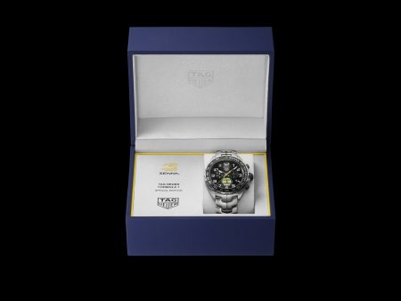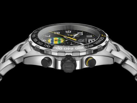 O TAG Heuer Formula 1 Chronograph x Senna 43mm, equipado com movimento de quartzo, revisita a pulseira S/EL usada por Senna, símbolo do design esportivo do fim dos anos 1980. A caixa de 43 mm em aço abriga um mostrador preto sunray com detalhes em amarelo e verde, com três contadores: segundos contínuos às 3 horas; cronógrafo de 10 horas às 6 horas nas cores da bandeira brasileira; e cronógrafo de 30 minutos às 9 horas com ponteiro amarelo.