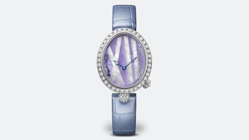 A marca de relógios suíça Breguet é mestre em misturar cores e pedras preciosas. Seu relógio Reine de Naples Princesse Mini 9818 habilmente abraça o Very Peri com um magnífico mostrador de madrepérola com tons de lavanda. Confeccionada em ouro branco de 18 quilates, a caixa oval tem uma luneta cravejada com 64 diamantes lapidados, que intensificam a beleza do mostrador.
