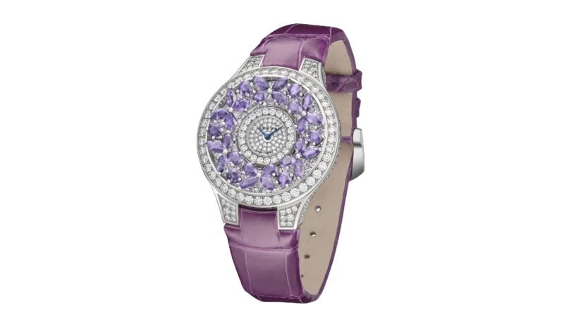 Já os ponteiros são roxos e a parte superior de cada elo de pulseira é majestosamente cravejada com pedras de ametista em tons claros, lapidadas em formato de baguete. O restante tem diamantes de lapidação brilhante. No total, o relógio de US$ 97 mil (cerca de R$ 535 mil) oferece mais de 10 quilates de diamantes e 6,65 quilates de pedras preciosas.