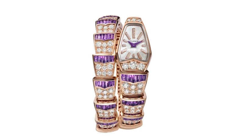 Com talvez um tom um pouco mais escuro que o Very Peri, o relógio Bulgari Serpenti Scaglie é uma abordagem divertida e caprichosa para a cor deste ano. A ousada peça tem uma pulseira em espiral, que envolve o pulso de forma atraente. Esta versão é confeccionada em ouro rosa 18 quilates e tem um mostrador em madrepérola com marcadores de diamante.