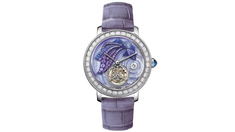 A peça de US$ 125 mil (cerca de R$ 690 mil) é cravejada com mais de 200 pedras preciosas: 3,93 quilates de safiras violetas e 5,5 quilates de diamantes, tudo em ouro branco de 18 quilates. É alimentado por um movimento de quartzo.