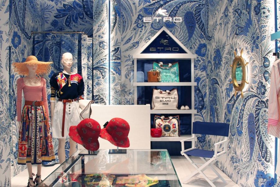 A Etro está abrindo suas lojas pop-up em vários destinos internacionais de férias, como Forte dei Marmi na Itália, Hamptons em Nova York, Dubai, Sochi na Rússia e Bodrum na Turquia. No local Forte dei Marmi, a loja homenageia o verão italiano com suas paredes paisley azuis e brancas e espelhos em forma de roda de navio. O pop-up oferece peças da coleção Primavera/Verão 2021 de Etro, além de uma coleção de cápsulas temáticas de edição limitada.