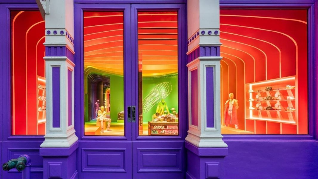 O Walk in the Park, da Louis Vuitton, é uma loja vibrante no bairro de SoHo, em Manhattan, com sapatos e acessórios do Diretor Criativo Masculino Virgil Abloh. Além do exterior roxo arrojado, o espaço futurista apresenta arcos de néon coloridos inspirados na Pont Neuf de Paris.