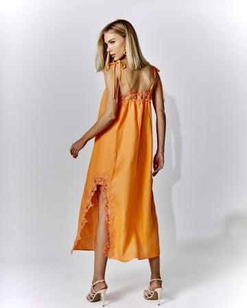 Os vestidos fluídos são escolhas perfeitas para o clima ameno do outono e proporcionam conforto e estilo. O detalhe em renda oferece conforto sem sacrificar o estilo, garantindo muita elegância! Invista em guipir com flores minimalistas na fenda lateral e no busto do vestido.