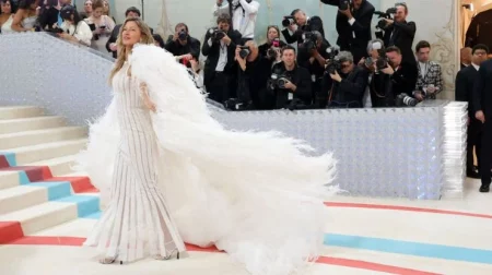 Na ocasião, a modelo repetiu o vestido que usou o vestido branco criado por Karl Lagerfeld, designer que foi tema do evento em 2023, para a coleção de alta-costura primavera-verão 2007 da Chanel.