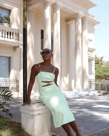 Tedência atemporal dos anos 90, o vestido de gola torcida com recortes rouba a cena novamente, possibilitando produções icônicas. A gola torcida e o busto dão destaque ao look, com uma simplicidade chique e elegante. Os tons de nude funcionam muito bem na peça, mas o pretinho básico também é uma ótima opção.