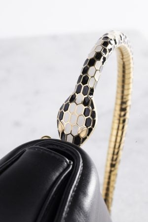 Inspirada no vasto acervo e no incomparável DNA joalheiro da marca, a alça metálica da bolsa remete ao icônico relógio-joia Bvlgari Serpenti Harlequin de 1968, adornado com esmaltação multicolorida. Esse modelo serviu como inspiração para uma das primeiras colaborações entre a Maison e Mary Katrantzou, que hoje continua explorando as múltiplas facetas do ícone Serpenti em seu papel como Diretora Criativa de Artigos de Couro e Acessórios da Bvlgari.