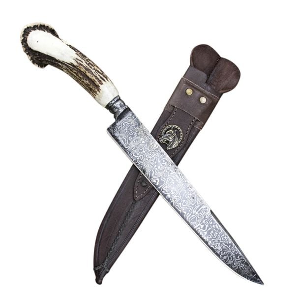 Faca feita em aço Damasco com dorso mosqueado. Lâmina de qualidade premium com cabo em chifre de cervo com alpacas. Bainha em couro bovino costurada a mão,