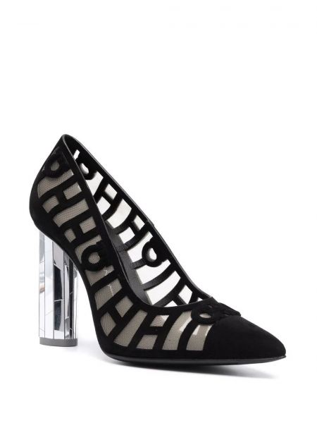 Detalhes perfurados, recorte com tela fechada, efeito craquelado, bico fino, solado de couro com logo, modelagem slip-on e salto alto.