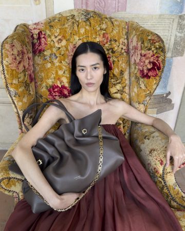 Segurando o couro nappa macio de uma bolsa perfurada com o icônico Gancini, ou uma interpretação em algodão desfiado da icônica Hug, Liu Wen e Claudia Campana são emolduradas como figuras de retratos renascentistas, mas retratadas com uma despreocupação contemporânea.