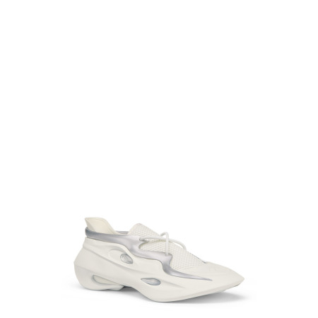 Continuando a postura progressiva da FENDI no calçado masculino, um tênis de moda slip-on apresenta uma sola orgânica moldada por injeção e parte superior com detalhes em bolha de dois tons e detalhes metálicos sombreados – seu perfil baixo e plano cria um gesto ergonômico e aerodinâmico. Os cadarços minimalistas desaparecem na parte superior ondulada acima de uma língua de malha, com o logotipo da FENDI aparecendo sob um detalhe de bolha transparente na borda externa. Três cores exclusivas combinam com as bolsas Peekaboo ISeeU, em cinza com detalhes em amarelo, preto com detalhes em azul escuro ou off white com detalhes em prata.