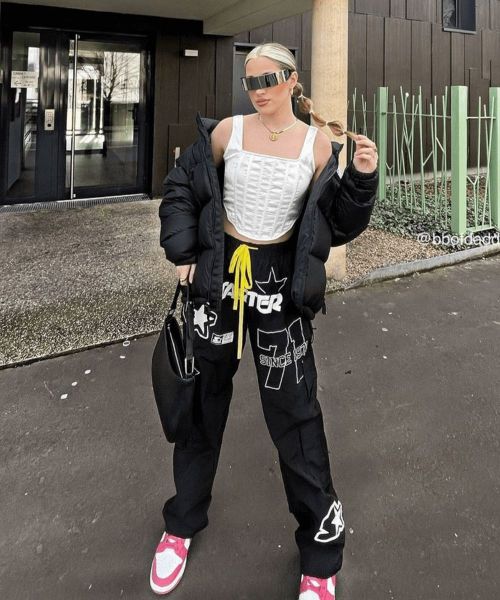 Além do visual arrumadinho, os looks com corset também transitam no universo streetwear, e diga-se de passagem, funcionam super bem. Combine o modelo com uma calça com vibe mais esportiva – como esse modelo que lembra um uniforme de motocross -, uma jaqueta puffer bem estilosa e volumosa, e para os pés, um par de tênis da moda.