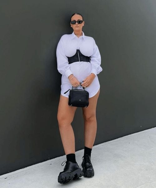 O inverno é a estação das sobreposições, e o corset é uma peça que funciona muito bem nesse truque de styling. Se sua intenção é um look mais ousado e super descolado, escolha sua camisa branca curinga favorita – de preferência os modelos que sejam alongados -, depois sobreponha seu corset. Para trazer impacto e peso para o look, opte por um sapato tratorado e meias aparentes. Ah! Se quiser acrescentar um toque de funcionalidade para a produção, coloque um short biker por baixo da camisa.