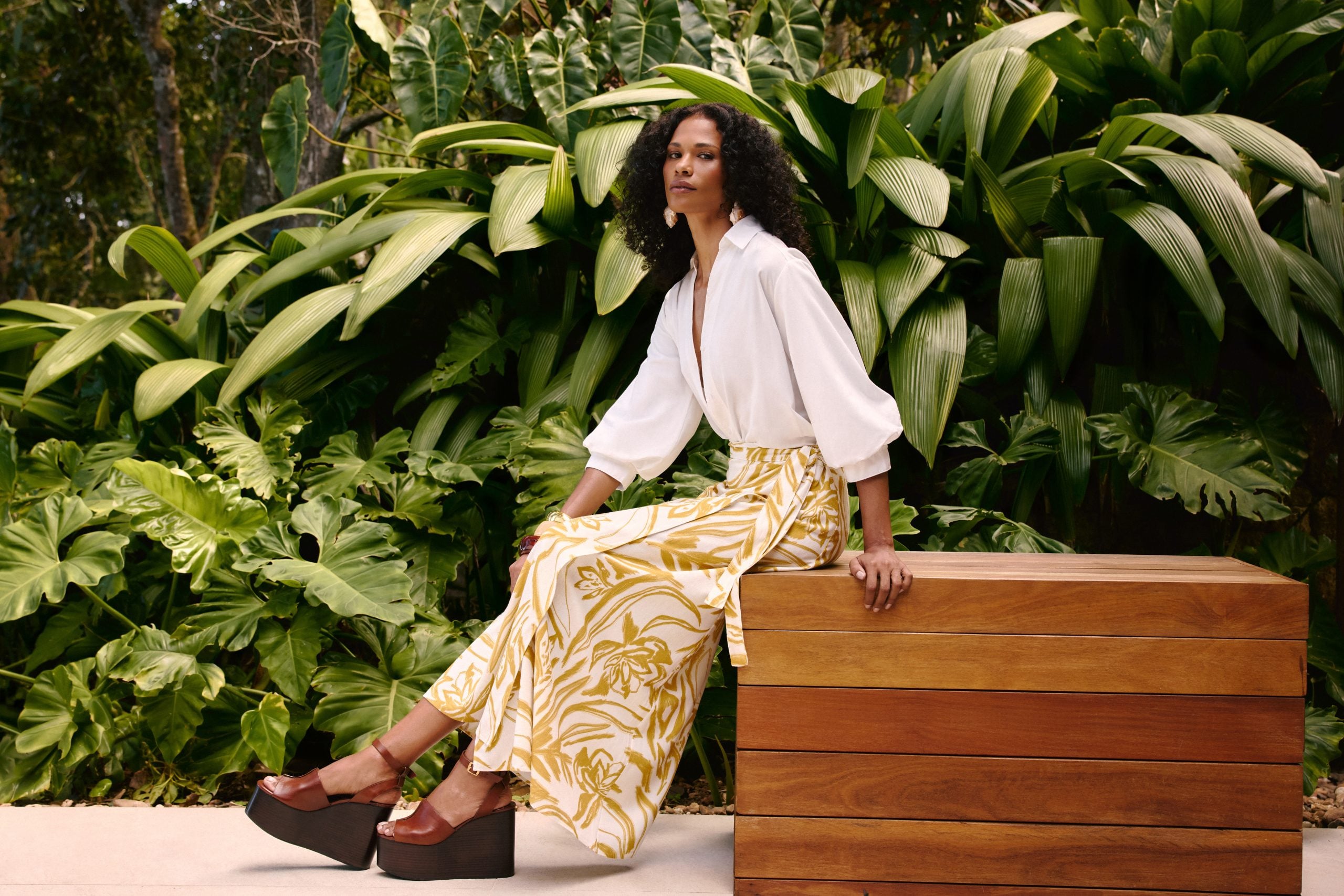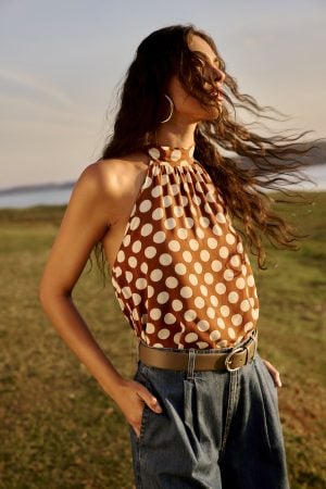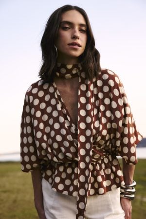 Estampas com flores e folhagens em amarelo vibrante aparecem em linho e viscose, trazendo movimento e naturalidade, enquanto o maxi poá marrom em viscose imprime personalidade a produções festivas. O lurex em tramas delicadas adiciona brilho sutil às blusas de modelagem solta, e as peças brancas em algodão e viscose iluminam os looks de verão.