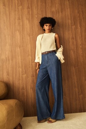 Nesta coleção, o jeans ganha um olhar atualizado com desbotamento vintage, lavanderia amaciada e pespontos marcados, que evidenciam a estética refinada da alfaiataria casual. As modelagens estruturadas garantem um caimento impecável, enquanto a cartela de cores – com tons terrosos, ocre e vermelhos – reforça o mood super feminino.