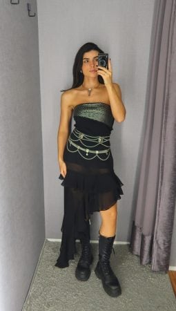 Nesse look, o ponto alto é o mix de cintos de correntes que combinam com as tachas da blusa, fazendo um conjunto lindo com essa saia de babado assimétrica. Coturno alto para dar um peso no look; afinal, estamos indo para um festival de música eletrônica, o sapato sempre deve ser confortável também.