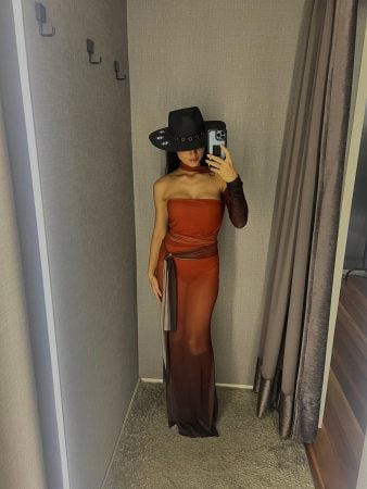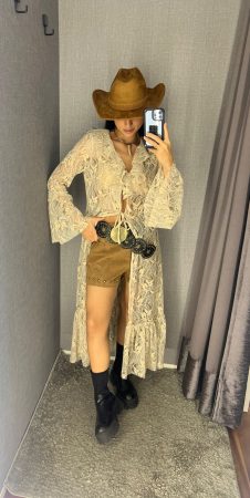 Vestidos de tule, principalmente os longos, trazem fluidez e leveza à produção. Aposte em tons terrosos que remetem à natureza para entrar na vibe do LENDAA. O chapéu é o toque final que eleva o look com estilo e personalidade.