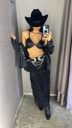 Um belo look all black também é muito bem-vindo, ainda mais com as franjas, que na saia trazem um super movimento.