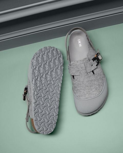 Os dois modelos são o mule Tokio e as sandálias Milano da Birkenstock com palmilha anatômica cortiça-látex. Eles estão vestidos respectivamente em feltro e camurça, tingidos com as cores da estação e cinza Dior.