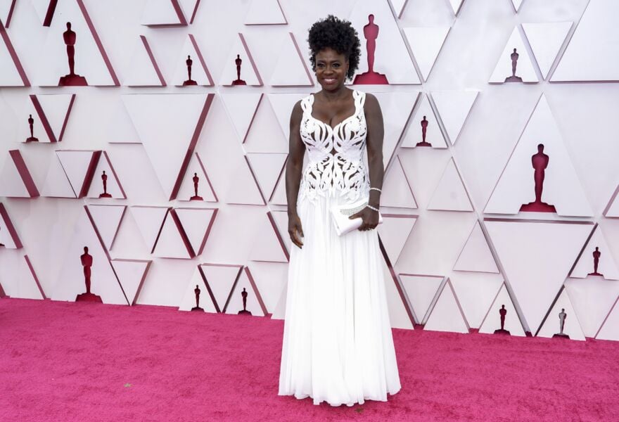 Viola Davis, que concorreu como Melhor Atriz, usou joias e vestido Alexander Mcqueen, Tiara Thomas trouxe um macacão com decote profundo e boás nas mangas — as quais, inclusive, foram destaques no Grammy, com os looks de Harry Styles —, e Maria Bakalova entregou tudo com esse vestido da Louis Vuitton. Bem noiva!