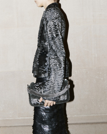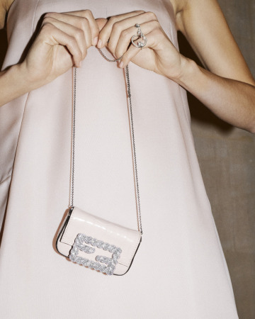 O conceito de preciosidade prática também é estendido às bolsas da coleção – uma série de bolsas Baguette personalizadas. Ecoando os materiais das roupas – desde croco macio forrado de vison até bordados fluidos com franjas – a Diretora Artística de Acessórios e Moda Masculina, Silvia Venturini Fendi, aborda as bolsas Baguette como objetos pessoais e suntuosos que vão do tamanho Nano até o Grande.