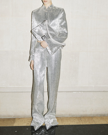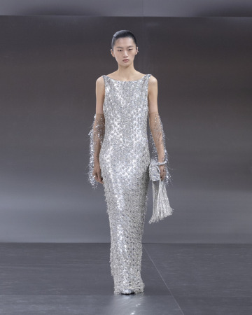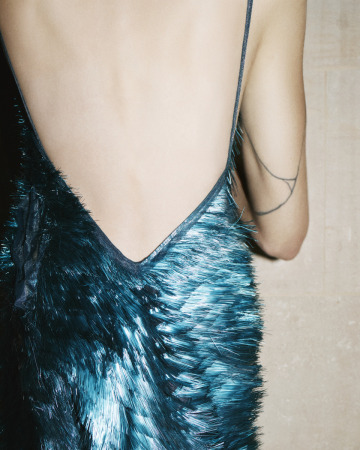 Ainda assim, é talvez na infinidade de bordados intensamente trabalhados que a decoração e a estrutura se tornam realmente entrelaçadas na coleção, aparecendo quase como peles do futuro. Em sua forma mais surpreendente, as emendas e cortes do DNA do que é natural e do que é feito pelo mundo artificial ocorrem nos bordados. Por exemplo, uma nova forma de franja, leve como uma pluma aparecem por toda parte como um novo tipo de pelagem. Com formato orgânico, ultra leve e fluida e delineada por delicados, mas rigorosos bordados feitos à mão, ela se move sinuosamente junto com quem a veste.