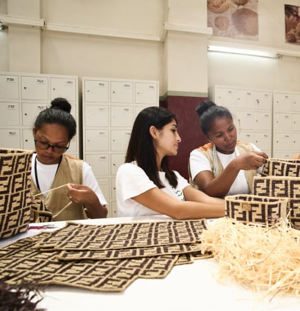 Made For A Woman incorpora uma visão de mudança que se alinha com a dedicação da FENDI à excelência e inovação. Com um ateliê enraizado em Antananarivo, o projeto emprega mais de 350 artesãs que criam peças excepcionais enquanto defendem o empoderamento feminino. A Made For A Woman, verificada pela Organização Mundial do Comércio Justo desde 2022, de fato fez avanços significativos em sua comunidade por meio de várias iniciativas alinhadas aos Objetivos de Desenvolvimento Sustentável das Nações Unidas. Estes incluem programas de saúde e bem-estar, oficinas de empoderamento de artesãos, políticas de discriminação zero, medidas de proteção à infância e esquemas de justiça ambiental.
