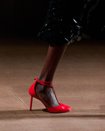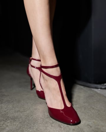 Os calçados trazem a elegância através dos scarpins de salto alto e com tiras duplas que envolvem o tornozelo