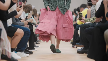 A peça que mais chamou atenção foi uma bermuda cargo oversized rosa vibrante, repleta de bolsos e camadas, em uma releitura utilitária com acabamento de alta-costura. O desfile também apostou em sapatos de estilo pescador com meias brancas, camisas abertas e, em alguns casos, apenas cuecas boxer, em looks conceituais e provocativos, marca registrada de Anderson.