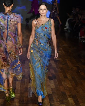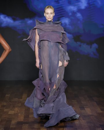 Com imagens de nuvens em movimento projetadas no telão, o desfile evocou a atmosfera de uma tempestade iminente. Em meio ao clima quase apocalíptico, surgiram criações volumosas, marcadas por nervuras elaboradas e recortes ousados — uma assinatura do estilista.