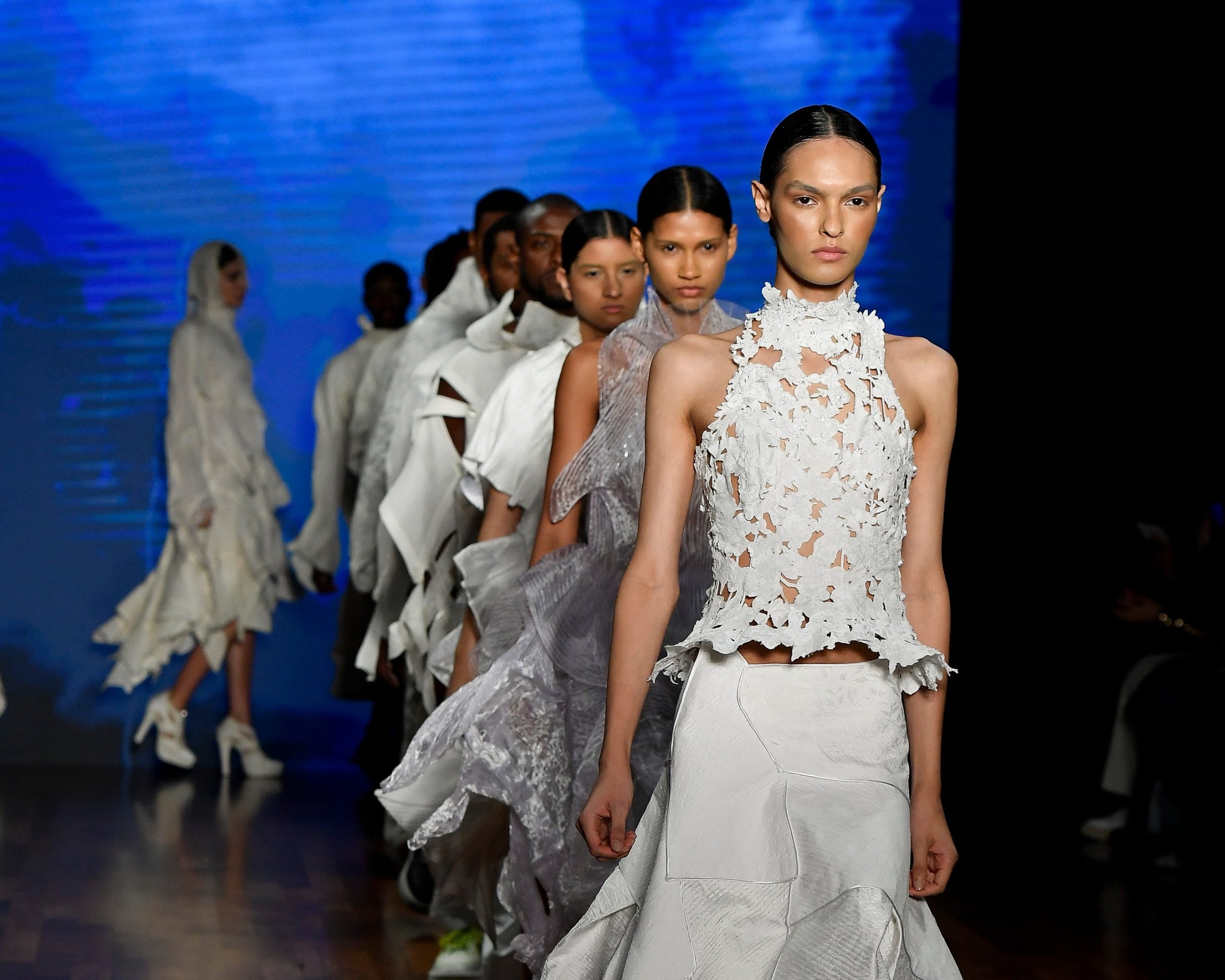 Com imagens de nuvens em movimento projetadas no telão, o desfile evocou a atmosfera de uma tempestade iminente. Em meio ao clima quase apocalíptico, surgiram criações volumosas, marcadas por nervuras elaboradas e recortes ousados — uma assinatura do estilista.