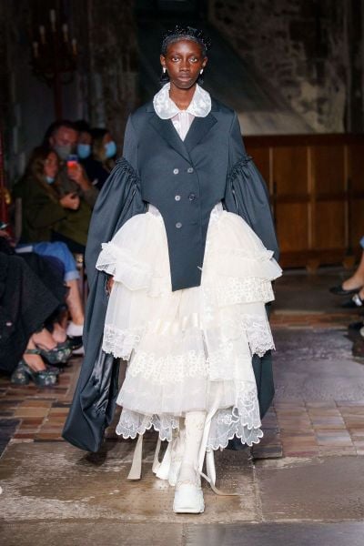 Simone Rocha entregou vários metros de renda e tule dobrados e apertados em silhuetas de bonecas – indiscutivelmente, a assinatura da marca – para a Primavera/Verão 2022.
