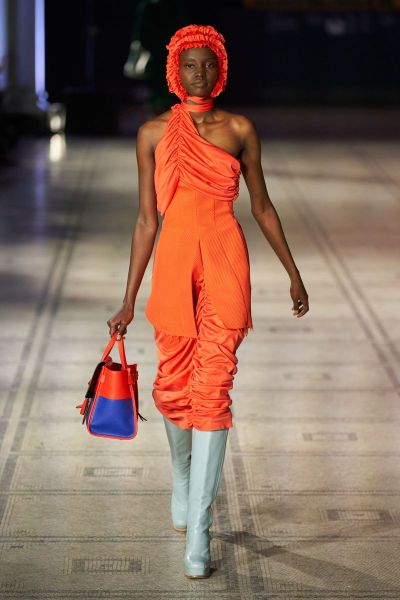 Sinônimo de silhuetas justas, a coleção Primavera/Verão 2022 de David Koma celebrava a forma feminina com estilos escultóricos e recortes de contorno. O show foi ambientado no London Aquatics Centre, e o clima era esportivo, mas luxuoso.
