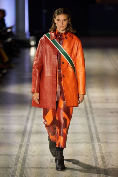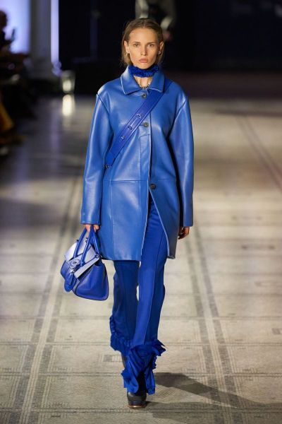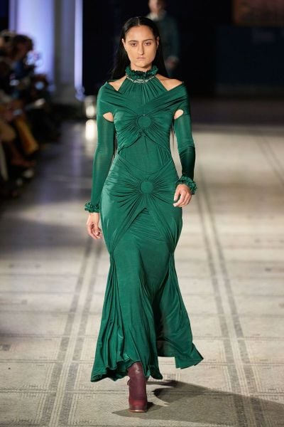 Drapeados habilidosos, com tecidos envolventes e cinturas apertadas, couros de cores vivas e enfeites com babados compunham a coleção Primavera/Verão de Richard Malone. Os verdes esmeraldas e os cinzas são a base do esquema de cores, enquanto os azuis cobalto da cabeça aos pés e as laranjas brilhantes eram destaques atraentes.