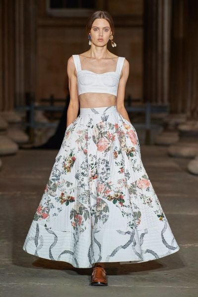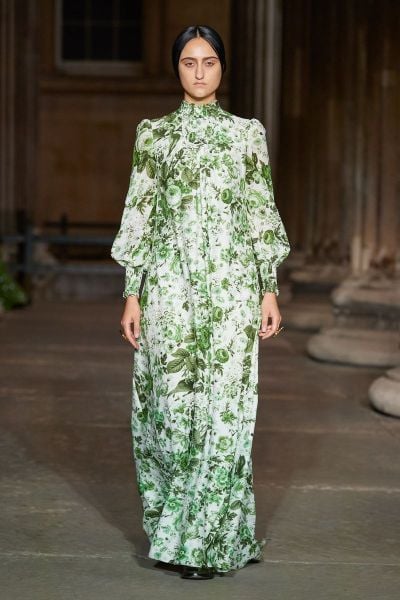Em uma carta de amor a Londres, o show do 15º aniversário de Erdem foi ambientado em uma colunata do Museu Britânico. Dedicado à coleção Primavera/Verão 2022 à poetisa Dame Edith Sitwell e à aristocrata e artista Lady Ottoline Morrell. “Sitwell e Morrell eram personagens enigmáticos que viviam nas periferias entre o mito e a realidade”, escreveu Moralioglu em suas anotações sobre o programa. “Nenhum dos dois estava interessado em se encaixar. Pelo contrário, gostavam de se destacar.”