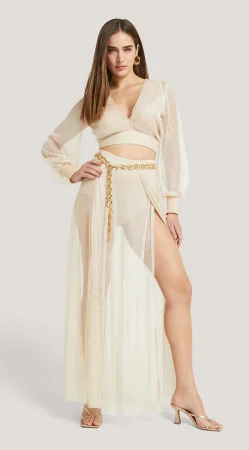 Saias e vestidos com transparências estratégicas trazem sensualidade equilibrada. Combine com tops estruturados e acessórios metalizados para criar uma proposta elegante sem excessos.