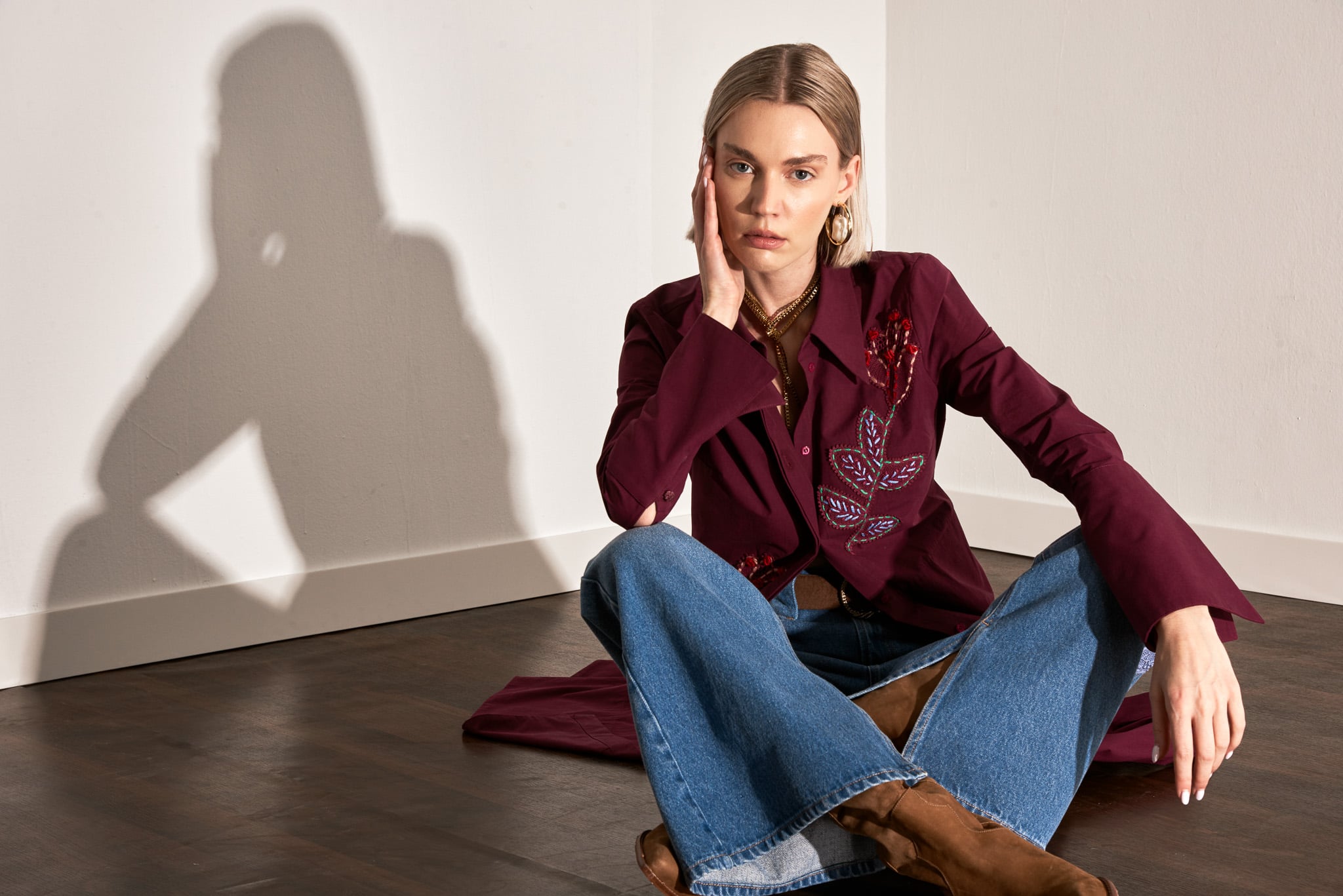 A cartela de cores selecionadas traz o Vinho Mahogany, Azul Boreal e Off White, que se misturam entre si e servem como ponto de partida para a criação de blusas, top, camisa, chemise, blazer, casaquetto, vestidos, shorts, saias, calça e jardineira