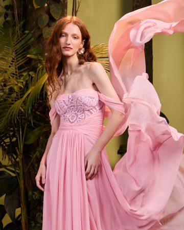 As peças-desejo em renda renascença seguem como símbolos da marca, trazendo sofisticação atemporal em vestidos longos, camisas e detalhes que realçam a delicadeza do feito à mão. Nos vestidos de festa, tecidos fluidos em cores suaves, como o rosa, ganham movimento e romantismo em construções que unem rendas e chiffon em composições etéreas, reforçando o apelo da coleção de celebrar a feminilidade em todas as suas formas.