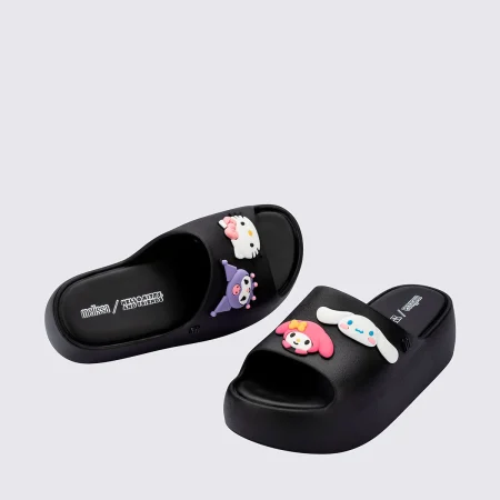 Entre os destaques da coleção, a Melissa Free Platform Slide + Hello Kitty and Friends aparece em quatro versões estampadas inéditas, combinando praticidade e irreverência.