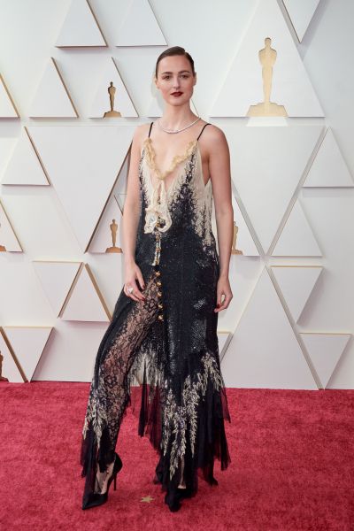 Conforme foi visto nas passarelas da Schiparelli, nada de básico nesta temporada – inclusive no preto. A atriz Maggie Gyllenhaal vestiu um look da marca na cerimônia do Oscar 2022.