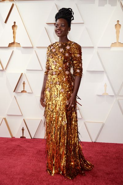 Quem chamou muita atenção pela quantidade de brilho no visual foi a vencedora do Oscar Lupita Nyong’o. Em um vestido reluzente da Prada, o design da estilista Miuccia Prada chamou atenção pelo formato da paetê – em fitas – e a meia manga, marca registrada da estilista.